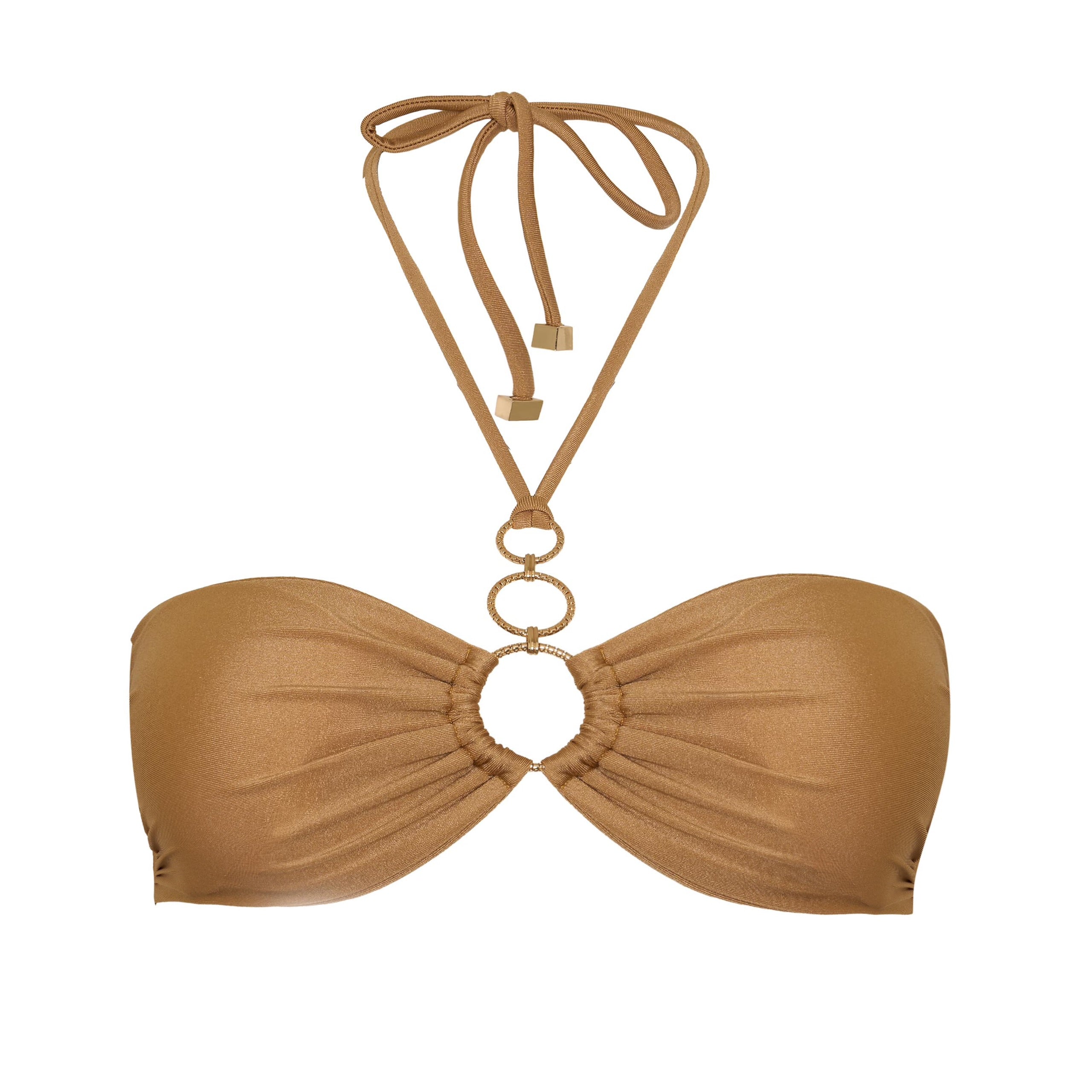 A statement bandeau with a sculptural edge. Anchored by cascading gold rings and a fixed halter strap for a lifted fit, it’s cut in a liquid-bronze, shiny fabric that flatters sun-kissed skin. Crafted from buttery-soft Nylon, it smooths and sculpts – it surely turns heads.