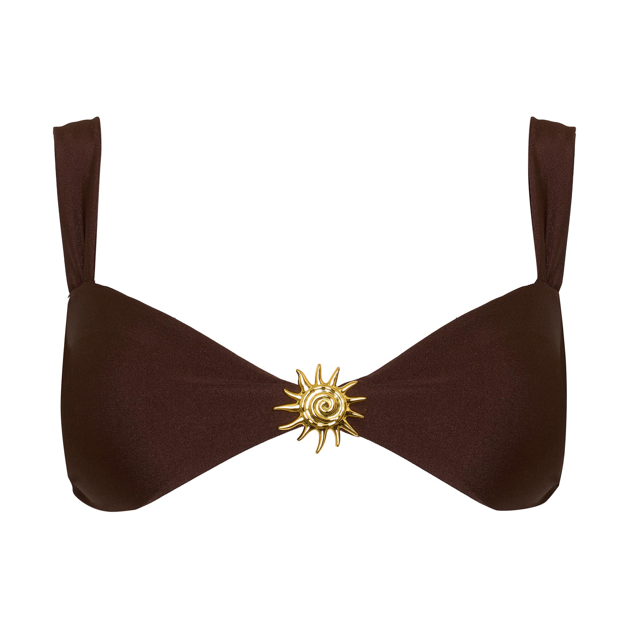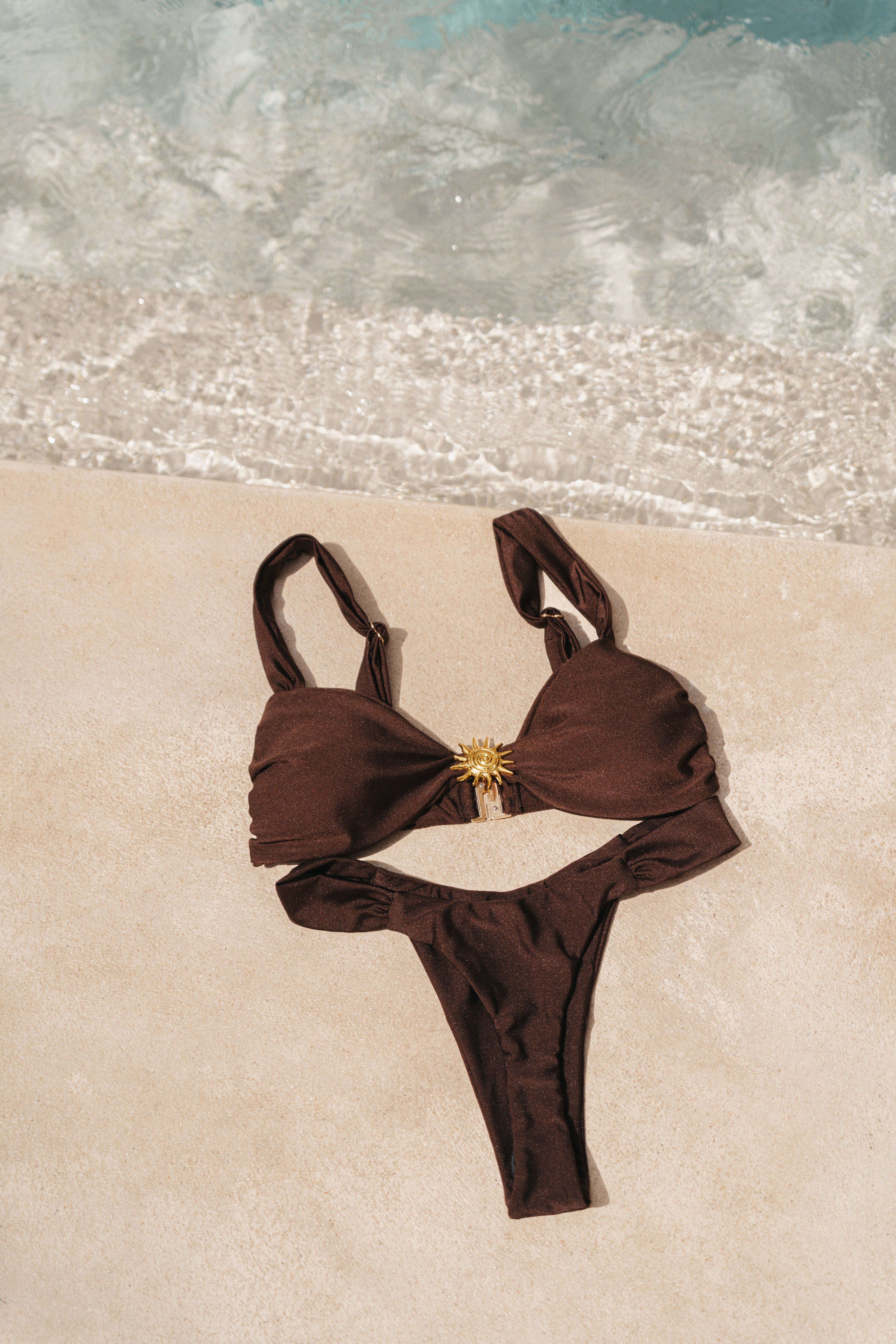 A refined halter in elegant espresso, anchored by our signature golden sun centerpiece. The wide straps frame the shoulders for a sculpted fit, while the golden hardware draws all eyes to the centre. Crafted in buttery-soft Nylon, this top blends elegance with a touch of boho vibes.